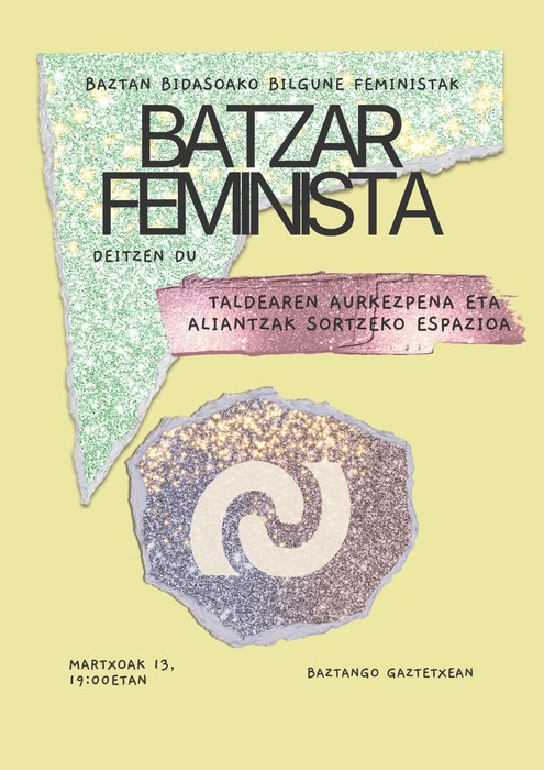 Euskal Herriko Bilgune Feminista, nazio mailako erakunde feminista abertzalea da. Maila nazionalean ez ezik, tokian toki ere antolatzen da eta, eta hala, berriki sortu berri dute Baztan Bidasoako Bilgune Feminista taldea. Taldearen aurkezpena egiteko zein aliantzak sortzeko espazioa bermatzeko batzar feminista eginen dutela iragarri dute. Martxoaren 13an izanen da, 19:00ean Baztango Gaztetxean. Ondotik merendu goxo bat prestatuko dute elkarrekin jateko.
