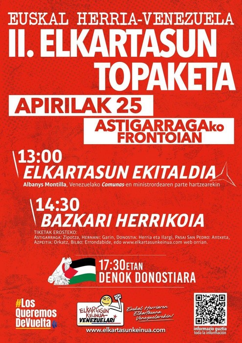 Elkartasun Keinua Venezuelari taldeak antolatuta, apirilaren 25ean Euskal Herria – Venezuela II. elkartasun topaketa ospatuko da Astigarragako frontoian. Jardunaldia eguerdiko 13:00etan hasiko da elkartasun ekitaldiarekin, eta bertan Albanys Montilla Venezuelako Comunen eta Mugimendu Sozialen ministrordeak parte hartuko du. Ondoren, 14:30ean, bazkari herrikoia egingo da.