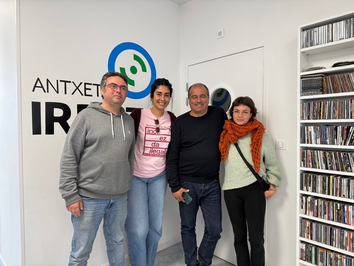 Irrati komunitarioaren 25 urteko proiektua eta etorkizuneko erronkak ezagutu zituen bertatik bertara, Agus Hernan eta Aitor Errazkin Basurko, Antxeta Irratia eta Pausumedia elkarteko arduradunekin.