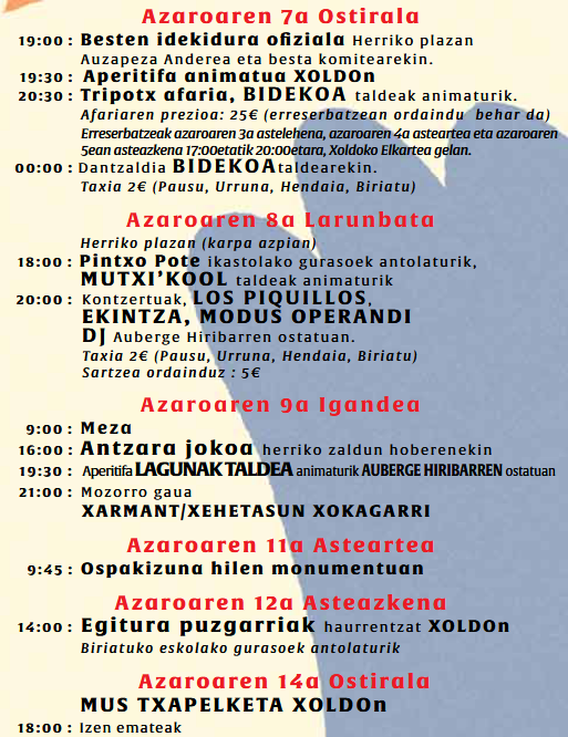 Biriatuko bestak iritsi dira, eta ostiral honetan emango diote hasiera ofiziala, arratsaldeko zazpietan herriko plazan egingo den ekitaldiarekin. Idekidura ondoren, herriko giroa bero jarriko du tripotx afari herrikoiak, 500 lagunendako prestatua. Afariaren antolakuntzan Camino Berri sagardotegikoek hartu dute ardura, iaz erretreta hartu arren aurten ere tripotx afarian laguntzea erabaki baitute. Guztira 1.500 tripotx, 200 kilo baino gehiago, egin dituzte, zortzi lagunek hiru egunez egindako lanaren emaitza gisa.