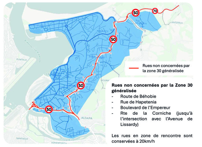 Baimenduriko abiadura gorena murriztu egin dute ia Hendaia osoan. Neurri honen helburua da eguneroko desplazamenduetan mugikortasunq eztitzea, eta karriken zirkulazioen arteko oreka aurkitzea. Bereziki, bizikleten zirkulazioa erraztu nahi dute, eta eremu publikoa lasaitu. Horretarako, zirkulazio handiena duten bide nagusietan izan ezik, hiri eremu osoan 30eko abiadura muga ezarri dute, eta txirrindulariak bi noranzkoetan ibili ahalko dira bide horietan, ezarritako seinaleek kontrako ez badiote. Salbuespen bakarrak Enperadorearen hiribidea, Pausu karrika (Rue de Behobie D810), Hapetenea karrika eta Erlaitzako Itsas Hegiko bidean D912 (Lizardi etorbidearen bidegurutzeraino) dira.