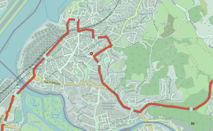 Honakoa da Korrikak Hendaian eginen duen ibilbidea, Pausutik Santiago zubira, mapan eskuinetik ezkerrera beraz.