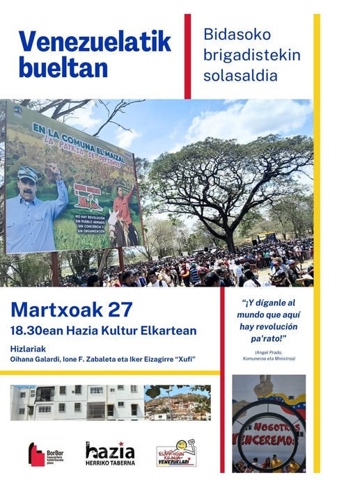 Esperientzia horiek guztiak partekatzeko eta Venezuelako herriaren errealitatea zabaltzeko, solasaldia antolatu dute Irunen, Hazia Kultur Elkartean, martxoaren 27an, ostirala, arratsaldeko 18:30ean. Bertan, brigadistek jasotako mezua helaraziko dute: Venezuelako eguneroko borroka eta ikuspegia lehen eskutik kontatzea, nazioarteko kontakizunari kontrapuntua emanez